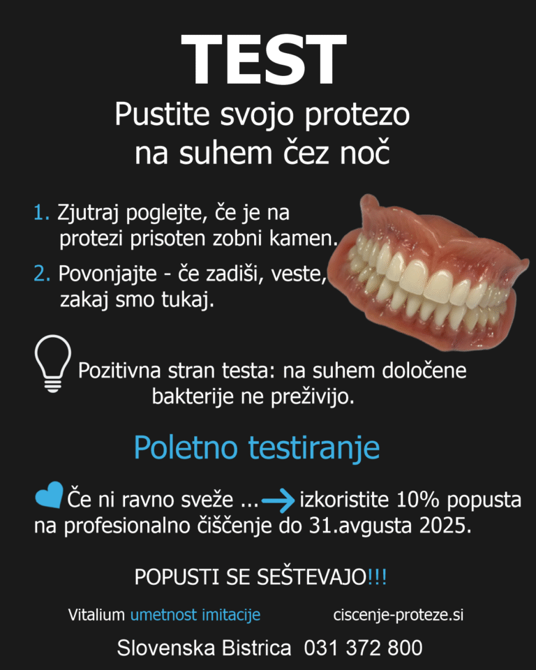 *dezinfekcija – namakanje v kopeli, ubije bakterije in glive, ki so lahko prisotne v mikroskopskih porah očiščene proteze.